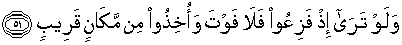 51. Dan (alangkah hebatnya) jikalau kamu melihat ketika mereka (orang-orang kafir) terperanjat ketakutan (pada hari kiamat); maka mereka tidak dapat melepaskan diri dan mereka ditangkap dari tempat yang dekat (untuk dibawa ke neraka),