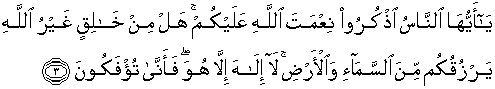 3. Hai manusia, ingatlah akan nikmat Allah kepadamu. Adakah pencipta selain Allah yang dapat memberikan rezki kepada kamu dari langit dan bumi ? Tidak ada Tuhan selain Dia; maka mengapakah kamu berpaling (dari ketauhidan)?