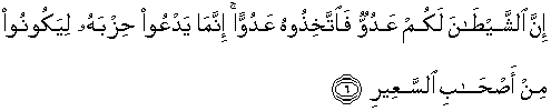 6. Sesungguhnya syaitan itu adalah musuh bagimu, maka anggaplah ia musuh(mu), karena sesungguhnya syaitan-syaitan itu hanya mengajak golongannya supaya mereka menjadi penghuni neraka yang menyala-nyala
