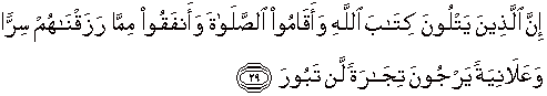 29. Sesungguhnya orang-orang yang selalu membaca kitab Allah dan mendirikan shalat dan menafkahkan sebahagian dari rezki yang Kami anuge-