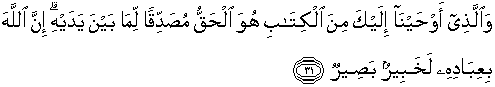 31. Dan apa yang telah Kami wahyukan kepadamu yaitu Al Kitab (Al Quran) itulah yang benar, dengan membenarkan kitab-kitab yang sebelumnya. Sesungguhnya Allah benar-benar Maha Mengetahui lagi Maha Melihat (keadaan) hamba-hamba-Nya.