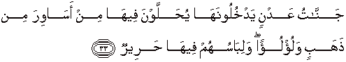 33. (Bagi mereka) syurga 'Adn mereka masuk ke dalamnya, di dalamnya mereka diberi perhiasan dengan gelang-gelang dari emas, dan dengan mutiara, dan pakaian mereka didalamnya adalah sutera.