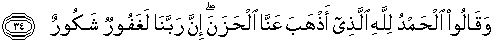 34. Dan mereka berkata: "Segala puji bagi Allah yang telah menghilangkan duka cita dari kami. Sesungguhnya Tuhan kami benar-benar Maha Pengampum lagi Maha Mensyukuri.