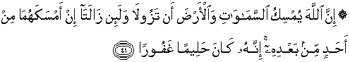 41. Sesungguhnya Allah menahan langit dan bumi supaya jangan lenyap; dan sungguh jika keduanya akan lenyap tidak ada seorangpun yang dapat menahan keduanya selain Allah. Sesungguhnya Dia adalah Maha Penyantun lagi Maha Pengampun.