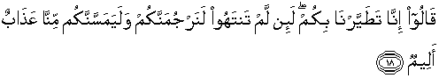 18. Mereka menjawab: "Sesungguhnya kami bernasib malang karena kamu, sesungguhnya jika kamu tidak berhenti (menyeru kami), niscaya kami akan merajam kamu dan kamu pasti akan mendapat siksa yang pedih dari kami."