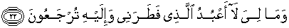 22. Mengapa aku tidak menyembah (Tuhan) yang telah menciptakanku dan yang hanya kepada-Nya-lah kamu (semua) akan dikembalikan?