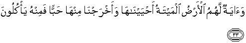 33. Dan suatu tanda (kekuasaan Allah yang besar) bagi mereka adalah bumi yang mati. Kami hidupkan bumi itu dan Kami keluarkan dari padanya biji-bijian, maka daripadanya mereka makan.
