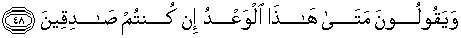 48. Dan mereka berkata: "Bilakah (terjadinya) janji ini (hari berbangkit) jika kamu adalah orang-orang yang benar?."