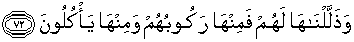 72. Dan Kami tundukkan binatang-binatang itu untuk mereka; maka sebahagiannya menjadi tunggangan mereka dan sebahagiannya mereka makan.