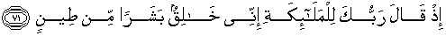 71. (Ingatlah) ketika Tuhanmu berfirman kepada malaikat: "Sesungguhnya Aku akan menciptakan manusia dari tanah."