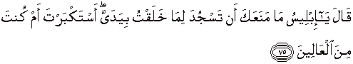 75. Allah berfirman: "Hai iblis, apakah yang menghalangi kamu sujud kepada yang telah Ku-ciptakan dengan kedua tangan-Ku. Apakah kamu menyombongkan diri ataukah kamu (merasa) termasuk orang-orang yang (lebih) tinggi?."