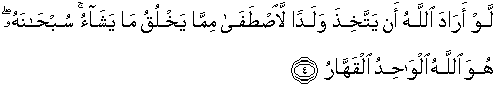 4. Kalau sekiranya Allah hendak mengambil anak, tentu Dia akan memilih apa yang dikehendaki-Nya di antara ciptaan-ciptaan yang telah diciptakan-Nya. Maha Suci Allah. Dialah Allah Yang Maha Esa lagi Maha Mengalahkan.