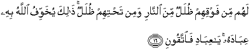 16. Bagi mereka lapisan-lapisan dari api di atas mereka dan di bawah merekapun lapisan-lapisan (dari api). Demikianlah Allah mempertakuti hamba-hamba-Nya dengan azab itu. Maka bertakwalah kepada-Ku hai hamba-hamba-Ku.