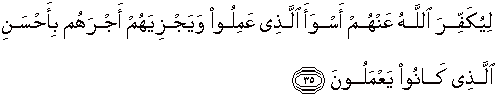 35. agar Allah akan menutupi (mengampuni) bagi mereka perbuatan yang paling buruk yang mereka kerjakan dan membalas mereka dengan upah yang lebih baik dari apa yang telah mereka kerjakan.