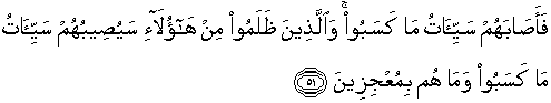 51. Maka mereka ditimpa oleh akibat buruk dari apa yang mereka usahakan. Dan orang-orang yang zalim di antara mereka akan ditimpa akibat buruk dari usahanya dan mereka tidak dapat melepaskan diri.