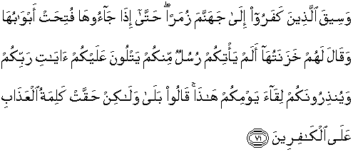71. Orang-orang kafir dibawa ke neraka Jahannam berombong-rombongan. Sehingga apabila mereka sampai ke neraka itu