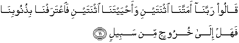 11. Mereka menjawab: "Ya Tuhan kami Engkau telah mematikan kami dua kali dan telah menghidupkan kami dua kali (pula), lalu kami mengakui dosa-dosa kami. Maka adakah sesuatu jalan (bagi kami) untuk keluar (dari neraka)?"