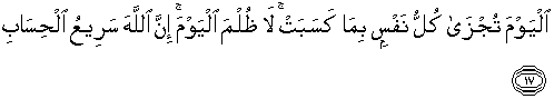 17. Pada hari ini tiap-tiap jiwa diberi balasan dengan apa yang diusahakannya. Tidak ada yang dirugikan pada hari ini. Sesungguhnya Allah amat cepat hisabnya.