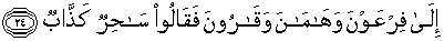 24. kepada Fir'aun, Haman dan Qarun; maka mereka berkata: "(Ia) adalah seorang ahli sihir yang pendusta."