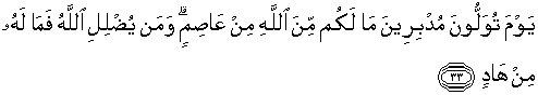 33. (yaitu) hari (ketika) kamu (lari) berpaling ke belakang, tidak ada bagimu seorangpun yang menyelamatkan kamu dari (azab) Allah, dan siapa yang disesatkan Allah, niscaya tidak ada baginya seorangpun yang akan memberi petunjuk.