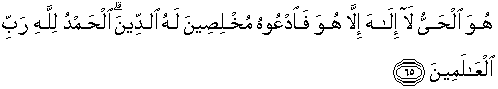 65. Dialah Yang hidup kekal, tiada Tuhan (yang berhak disembah) melainkan Dia; maka sembahlah Dia dengan memurnikan ibadat kepada-Nya. Segala puji bagi Allah Tuhan semesta alam.