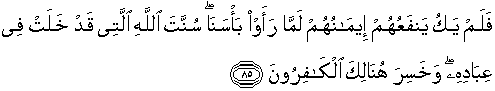 85. Maka iman mereka tiada berguna bagi mereka tatkala mereka telah melihat siksa Kami. Itulah sunnah Allah yang telah berlaku terhadap hamba-hamba-Nya. Dan di waktu itu binasalah orang-orang kafir.