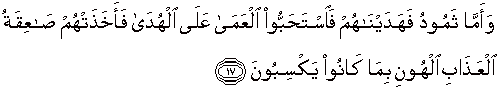 17. Dan adapun kaum Tsamud, maka mereka telah Kami beri petunjuk tetapi mereka lebih menyukai buta (kesesatan) daripada petunjuk, maka mereka disambar petir azab yang menghinakan disebabkan apa yang telah mereka kerjakan.