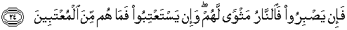 24. Jika mereka bersabar (menderita azab) maka nerakalah tempat diam mereka dan jika mereka mengemukakan alasan-alasan, maka tidaklah mereka termasuk orang-orang yang diterima alasannya.