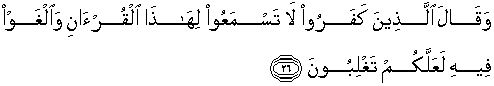 26. Dan orang-orang yang kafir berkata: "Janganlah kamu mendengar dengan sungguh-sungguh akan Al Quran ini dan buatlah hiruk-pikuk terhadapnya, supaya kamu dapat mengalahkan mereka."