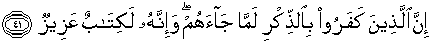 41. Sesungguhnya orang-orang yang mengingkari Al Quran ketika Al Quran itu datang kepada mereka, (mereka itu pasti akan celaka), dan sesungguhnya Al Quran itu adalah kitab yang mulia.