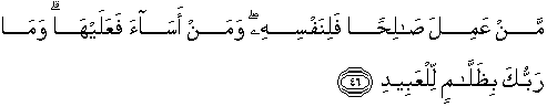 46. Barangsiapa yang mengerjakan amal yang saleh maka (pahalanya) untuk dirinya sendiri dan barangsiapa mengerjakan perbuatan jahat, maka (dosanya) untuk dirinya sendiri; dan sekali-kali tidaklah Rabb-mu menganiaya hamba-hambaNya.