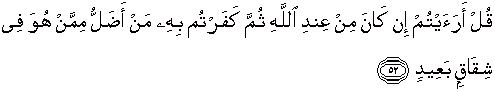 52. Katakanlah: "Bagaimana pendapatmu jika (Al Quran) itu datang dari sisi Allah, kemudian kamu mengingkarinya. Siapakah yang lebih sesat daripada orang yang selalu berada dalam penyimpangan yang jauh?"
