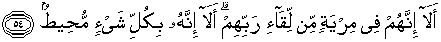 54. Ingatlah bahwa sesungguhnya mereka adalah dalam keraguan tentang pertemuan dengan Tuhan mereka. Ingatlah bahwa sesungguhnya Dia Maha Meliputi segala sesuatu.