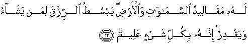 12. Kepunyaan-Nya-lah perbendaharaan langit dan bumi; Dia melapangkan rezki bagi siapa yang dikehendaki-Nya dan menyempitkan(nya). Sesungguhnya Dia Maha Mengetahui segala sesuatu.