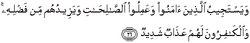 26. dan Dia memperkenankan (doa) orang-orang yang beriman serta mengerjakan amal yang saleh dan menambah (pahala) kepada mereka dari karunia-Nya. Dan orang-orang yang kafir bagi mereka azab yang sangat keras.