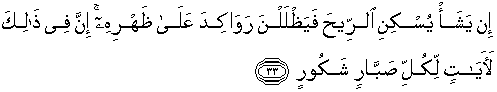 33. Jika Dia menghendaki, Dia akan menenangkan angin, maka jadilah kapal-kapal itu terhenti di permukaan laut. Sesungguhnya pada yang demikian itu terdapat tanda-tanda (kekuasaannya) bagi setiap orang yang banyak bersabar dan banyak bersyukur,