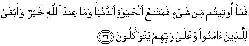 36. Maka sesuatu yang diberikan kepadamu, itu adalah kenikmatan hidup di dunia; dan yang ada pada sisi Allah lebih baik dan lebih kekal bagi orang-orang yang beriman, dan hanya kepada Tuhan mereka, mereka bertawakkal.