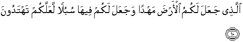 10. Yang menjadikan bumi untuk kamu sebagai tempat menetap dan Dia membuat jalan-jalan di atas bumi untuk kamu supaya kamu mendapat petunjuk.