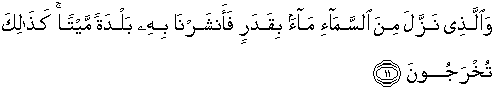11. Dan Yang menurunkan air dari langit menurut kadar (yang diperlukan) lalu Kami hidupkan dengan air itu negeri yang mati, seperti itulah kamu akan dikeluarkan (dari dalam kubur).