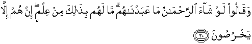 20. Dan mereka berkata: "Jikalau Allah Yang Maha Pemurah menghendaki tentulah kami tidak menyembah mereka (malaikat)." Mereka tidak mempunyai pengetahuan sedikitpun tentang itu, mereka tidak lain hanyalah menduga-duga belaka.