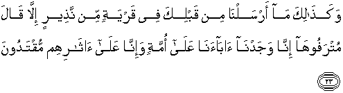 23. Dan demikianlah, Kami tidak mengutus sebelum kamu seorang pemberi