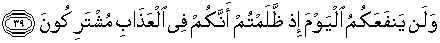 39. (Harapanmu itu) sekali-kali tidak akan memberi manfaat kepadamu di hari itu karena kamu telah menganiaya (dirimu sendiri). Sesungguhnya kamu bersekutu dalam azab itu.