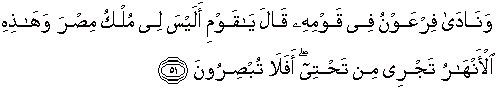 51. Dan Fir'aun berseru kepada kaumnya (seraya) berkata: "Hai kaumku, bukankah kerajaan Mesir ini kepunyaanku dan (bukankah) sungai-sungai ini mengalir di bawahku; maka apakah kamu tidak melihat(nya)?
