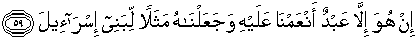 59. Isa tidak lain hanyalah seorang hamba yang Kami berikan kepadanya nikmat (kenabian) dan Kami jadikan dia sebagai tanda bukti (kekuasaan Allah) untuk Bani lsrail