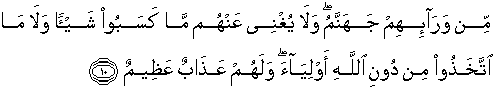 10. Di hadapan mereka neraka Jahannam dan tidak akan berguna bagi mereka sedikitpun apa yang telah mereka kerjakan, dan tidak pula berguna apa yang mereka jadikan sebagai sembahan-sembahan (mereka) dari selain Allah. Dan bagi mereka azab yang besar.
