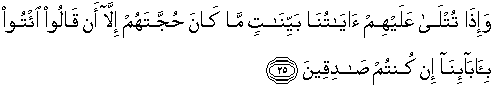 25. Dan apabila dibacakan kepada mereka ayat-ayat Kami yang jelas, tidak ada bantahan mereka selain dari mengatakan: "Datangkanlah nenek moyang kami jika kamu adalah orang-orang yang benar."