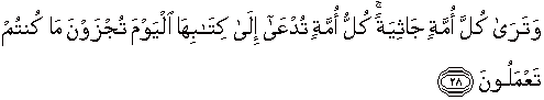 28. Dan (pada hari itu) kamu lihat tiap-tiap umat berlutut. Tiap-tiap umat dipanggil untuk (melihat) buku catatan amalnya. Pada hari itu kamu diberi balasan terhadap apa yang telah kamu kerjakan.
