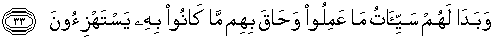 33. Dan nyatalah bagi mereka keburukan-keburukan dari apa yang mereka kerjakan dan mereka diliputi oleh (azab) yang mereka selalu memperolok-olokkannya.