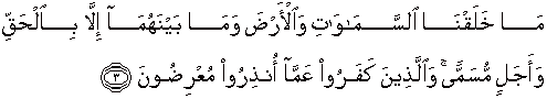 3. Kami tiada menciptakan langit dan bumi dan apa yang ada antara keduanya melainkan dengan (tujuan) yang benar dan dalam waktu yang ditentukan. Dan orang-orang yang kafir berpaling dari apa yang diperingatkan kepada mereka.