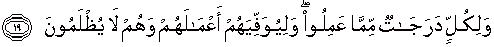19. Dan bagi masing-masing mereka derajat menurut apa yang telah mereka kerjakan dan agar Allah mencukupkan bagi mereka (balasan) pekerjaan-pekerjaan mereka sedang mereka tiada dirugikan.